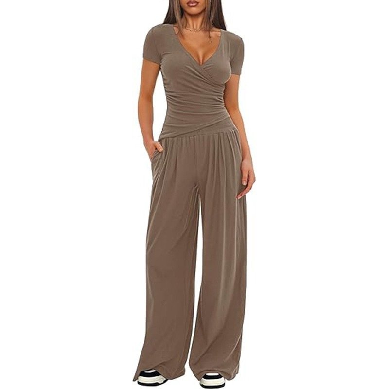 This set features a flattering V-neck short-sleeve top paired with wide-leg pants, creating a chic and relaxed silhouette.